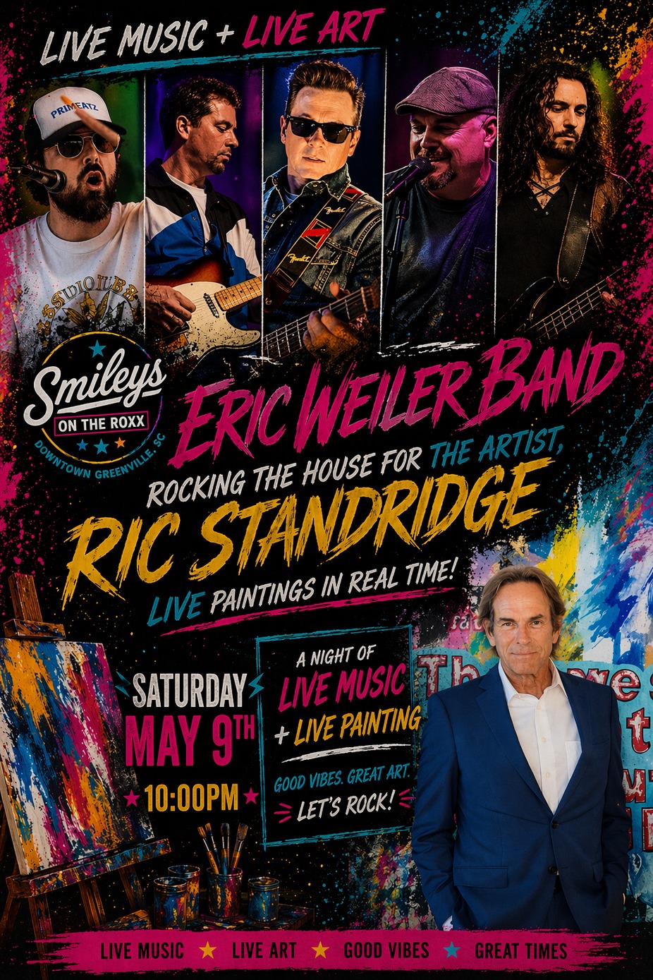 Bonus set of Art in Motion Series as local artist, Ric Standridge, paints live to the high-energy groove of The Eric Weiler Band! Watch as Ric transforms music into vibrant works of art using his gift of synesthesia—hearing colors—to create masterpieces before your eyes. Each piece will be available for purchase after the show.