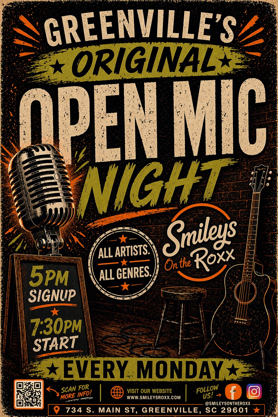 Kick off your week with the most welcoming, laid-back, talent-packed night in town! Open Mic Mondays at Smileys On The Roxx bring together local musicians, singer-songwriters, poets, comedians, and anyone ready to share something creative on stage. Whether you’re stepping up to the mic for the first time or you’re a seasoned performer looking to try out new material, this is your room.