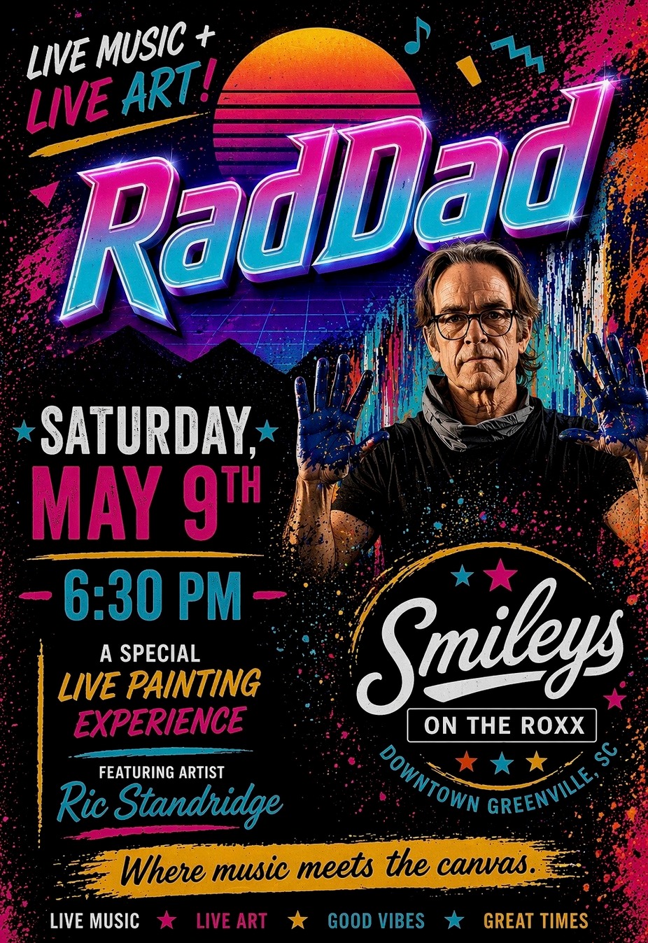 Experience wildly talented local artist, Ric Standridge, as he paints live to the electrifying sounds of Rad Dad! Watch as Ric transforms music into vibrant works of art using his gift of synesthesia—hearing colors—to create masterpieces before your eyes. Each piece will be available for purchase after the show.