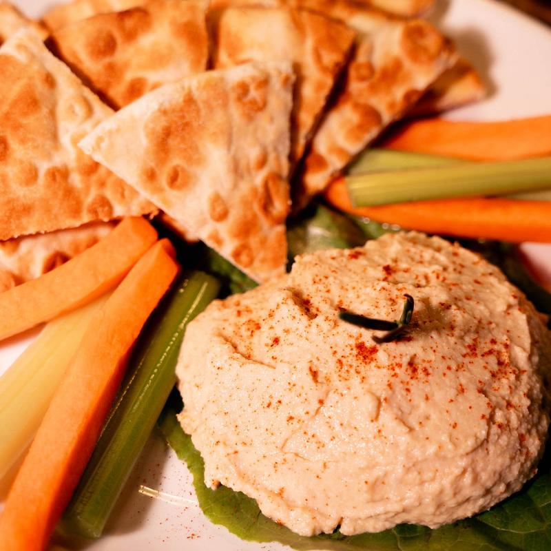 Traditional hummus with carrots, celery, and pita | GF Tortilla chips available