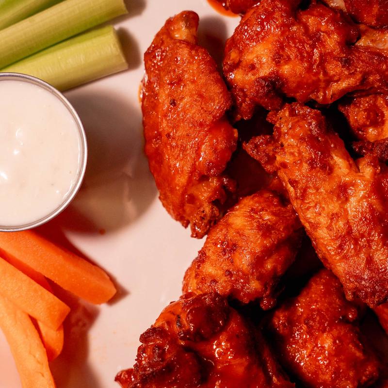 Large wings in your choice of Buffalo, Teriyaki, Hotyaki, Lemon Pepper, Cajun Dry Rub, BBQ or Plain with side of ranch or blue cheese and celery/carrots